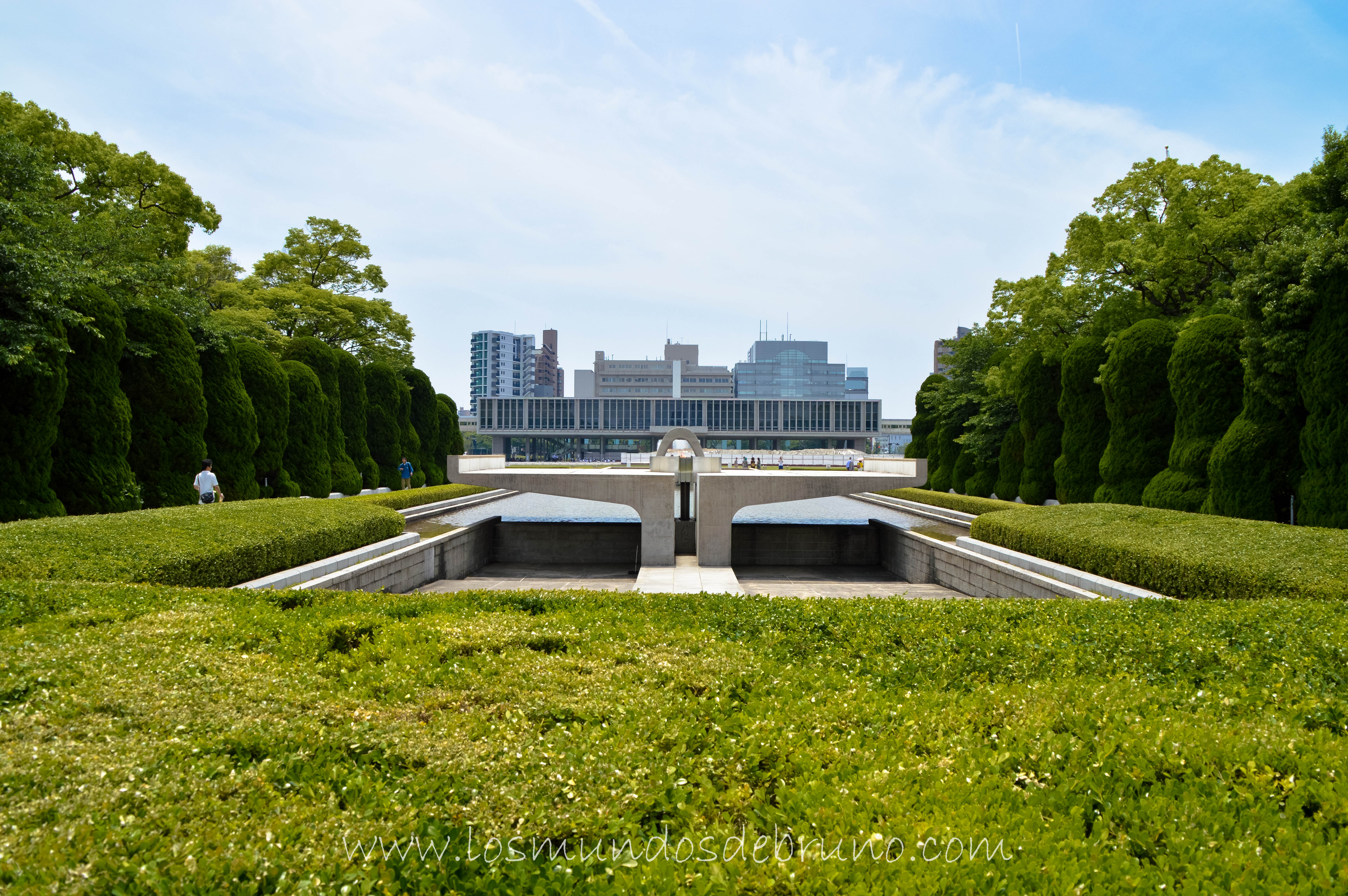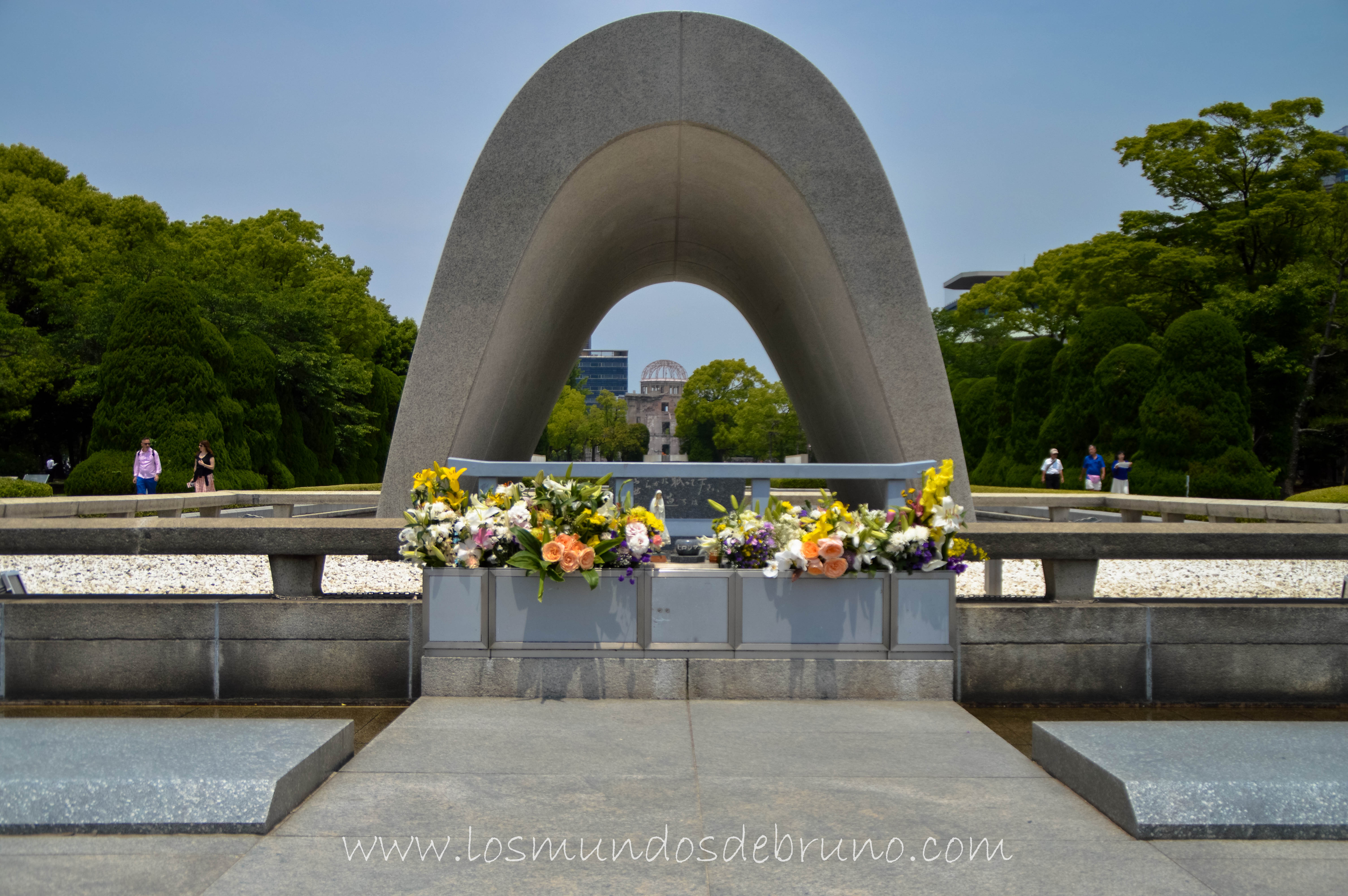 Una vez finalizada la visita al museo y habiendo tomado conciencia de la dimensión del horror una buena manera de rendir un tributo a los fallecidos es pasear por el Parque Conmemorativo de la Paz de Hiroshima y guardar unos minutos de silencio frente al Cenotafio Conmemorativo de Hiroshima a través del cual tendremos una visión perfecta del Genbaku Domu al fondo.